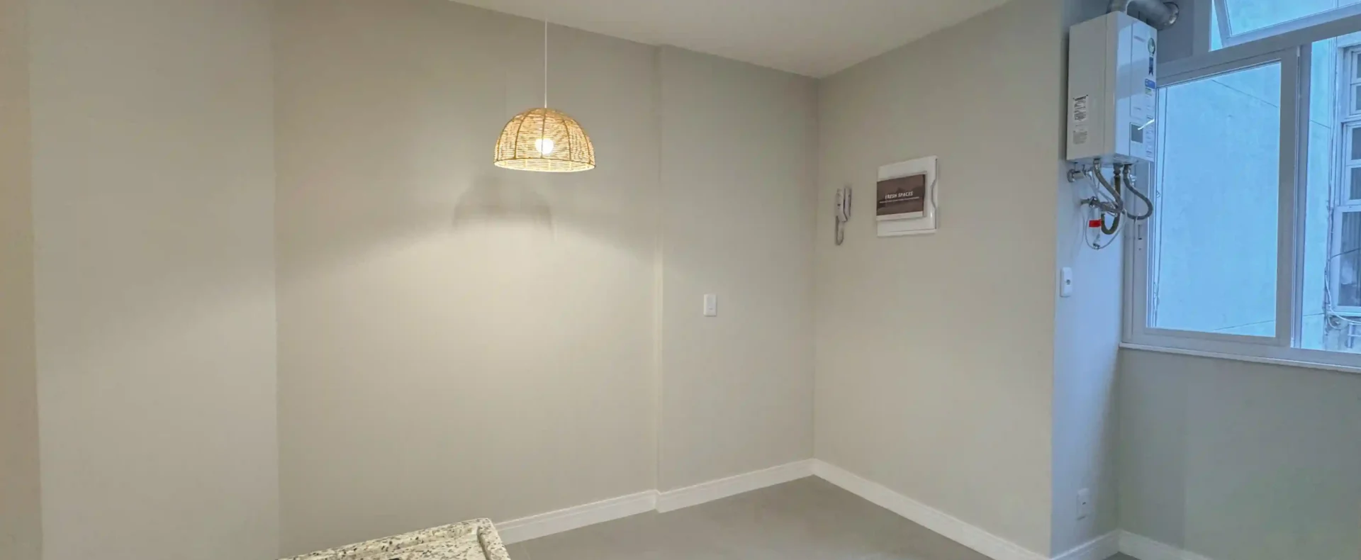 The apartment features two bedrooms, including one suite, plus a flexible room ideal for a home office. The open-plan living area integrates seamlessly with the kitchen, filled with natural light. Custom cabinets and fully renewed electrical and plumbing systems enhance both style and function.